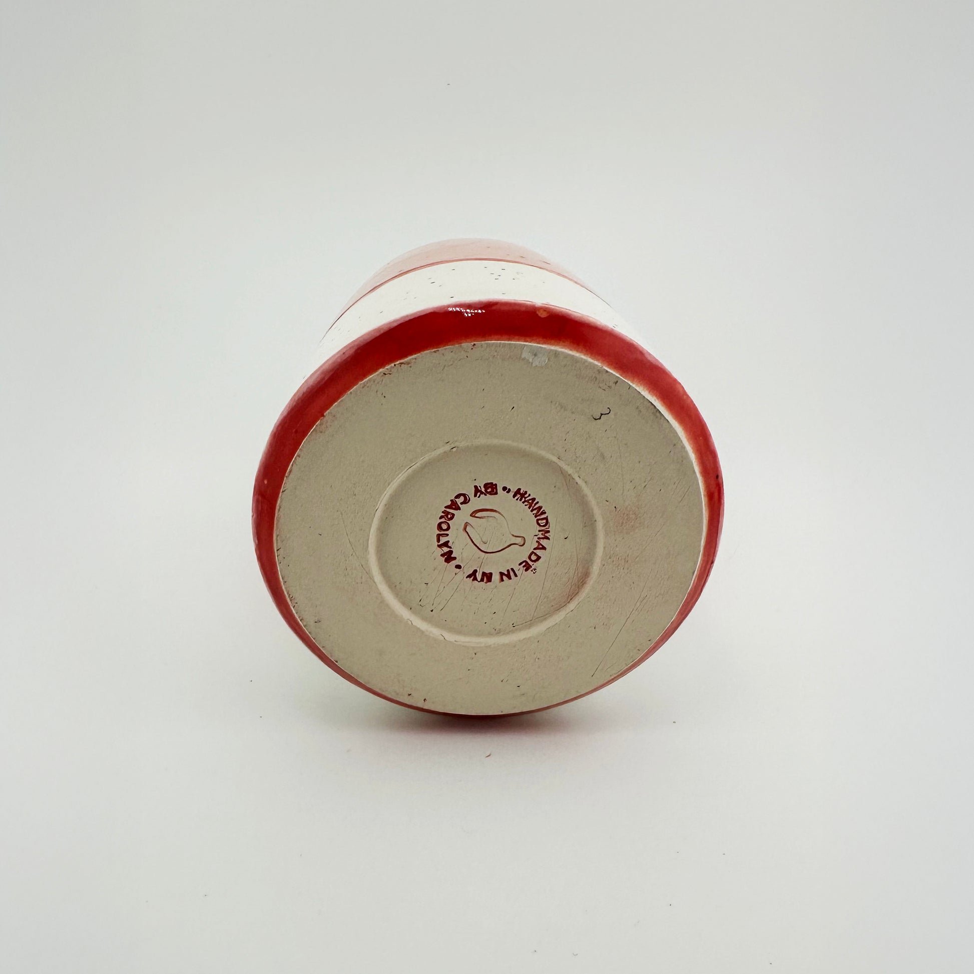 At the top, a pinhole opening reveals another flash of red, making this piece as striking empty, as it is with a single stem. Glazed, watertight interior.