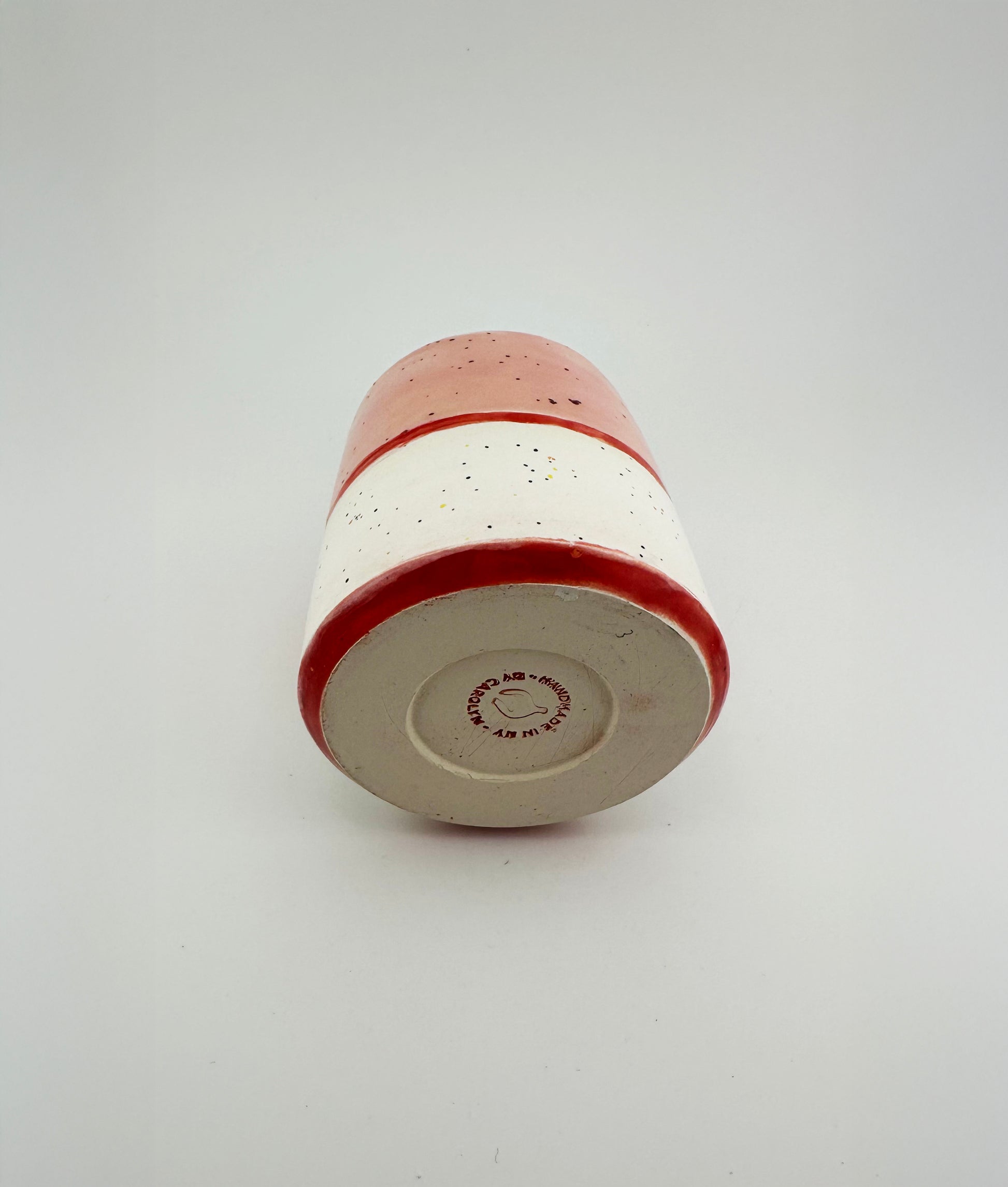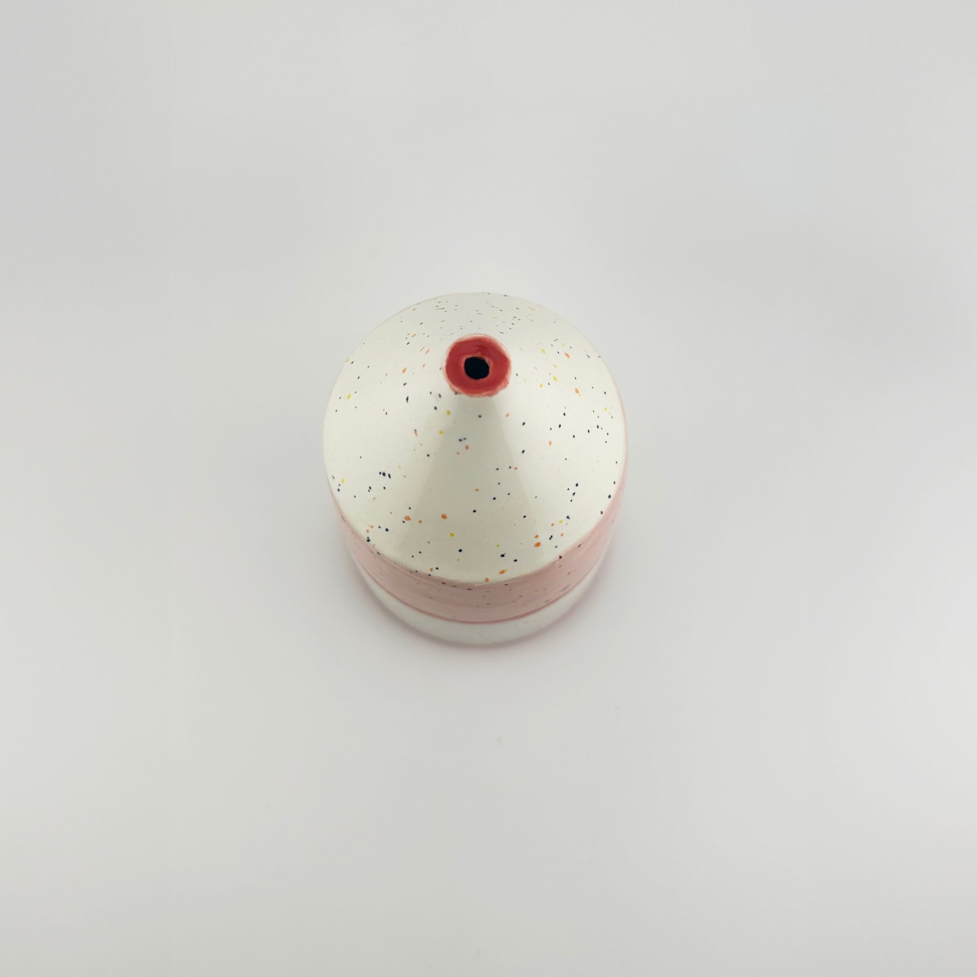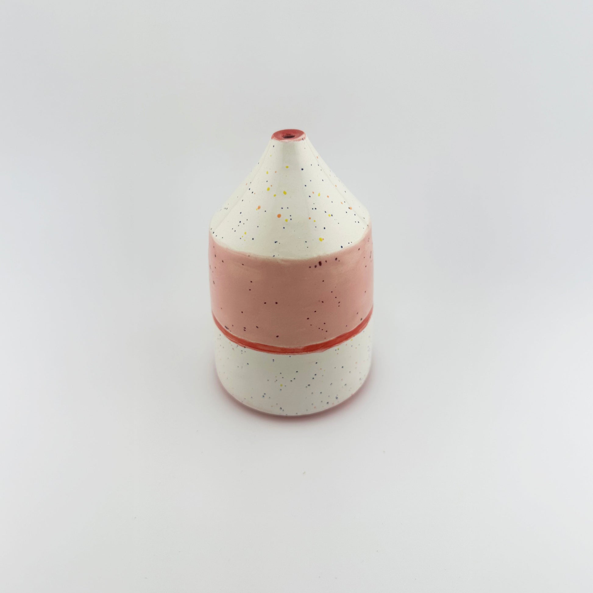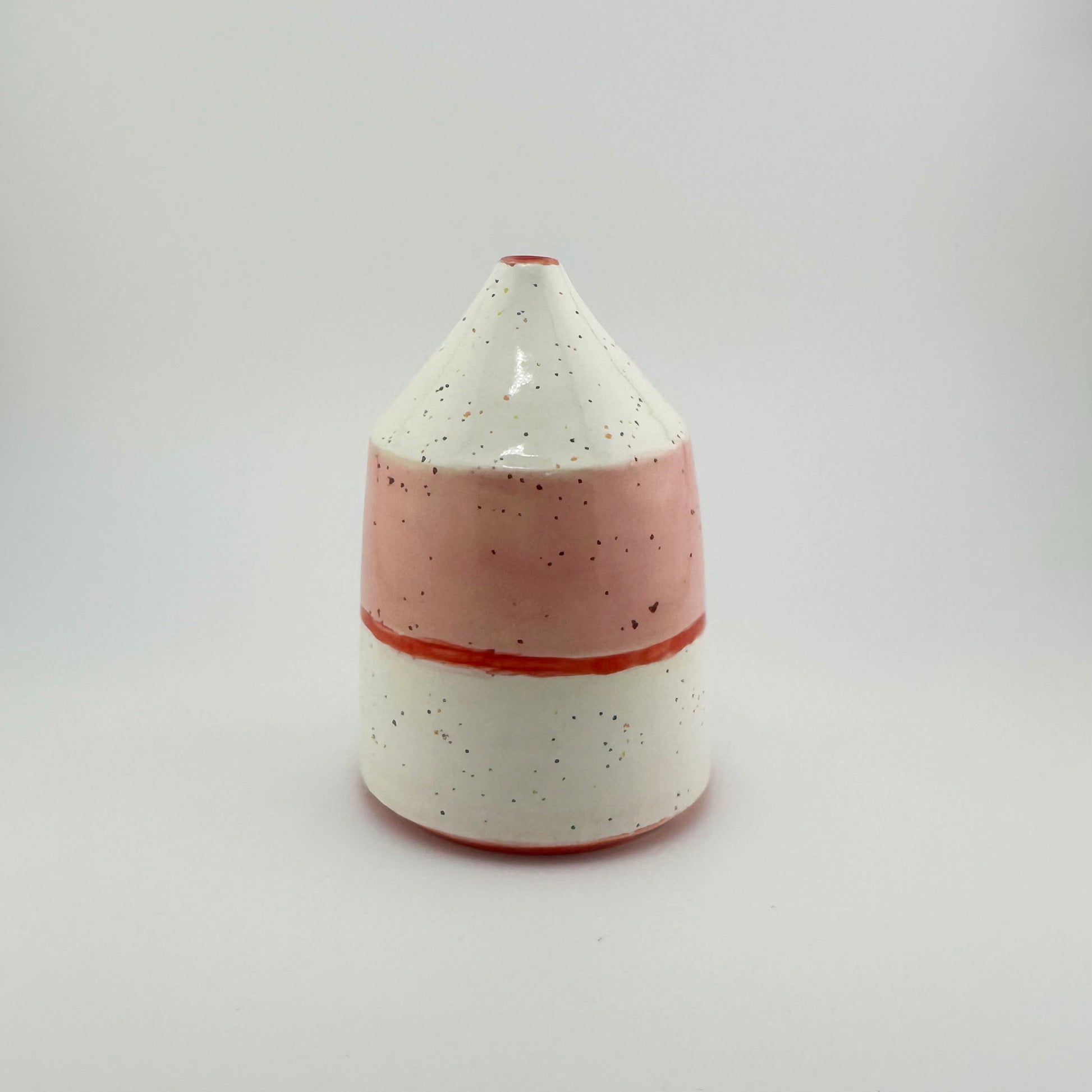 This sculptural vase pairs clean geometry with playful color. Its conical top and straight sides create a bold silhouette, softened by a surface of contrasting pink and white glaze scattered with speckles. A hand-painted band of bright red wraps around the middle, breaking up the form with a deliberate clash.