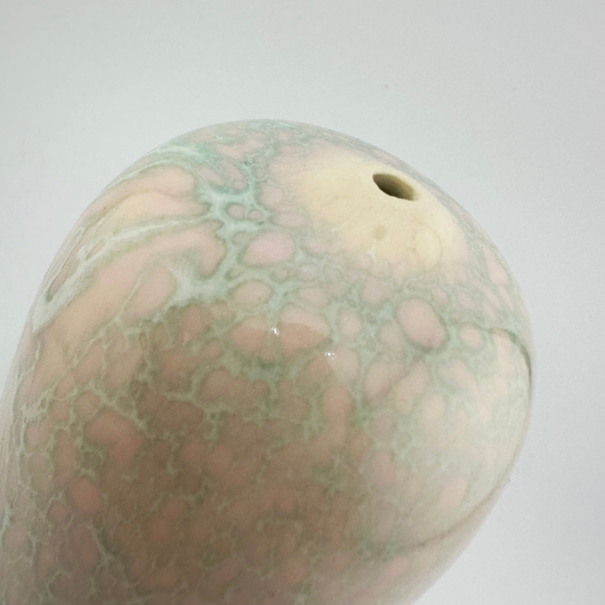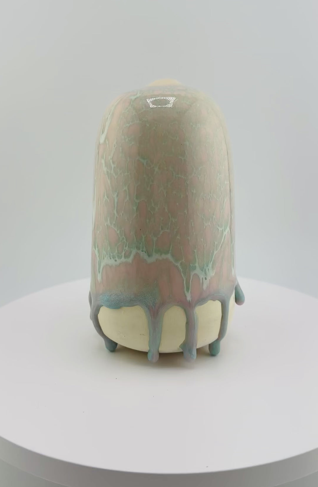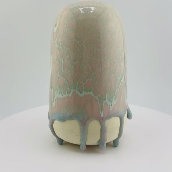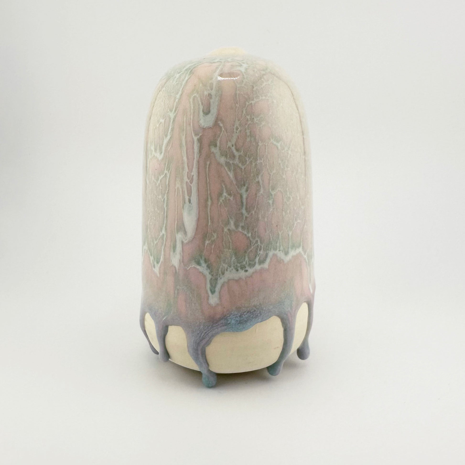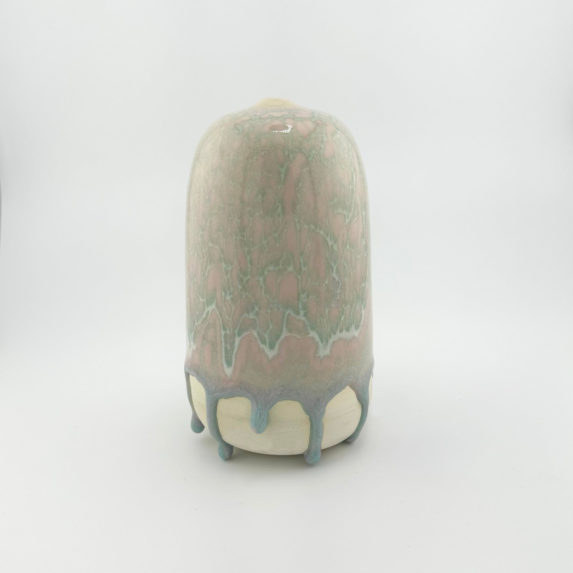 A hand-thrown ceramic vase with a pinhole opening for a single stem. Finished with three glazes that have interacted in the kiln to create a seafoam effect. At the base, glaze drips have solidified into sculptural glassy feet, giving the piece the appearance of hovering above the table. The result is truly organic, a result of allowing the glaze to have its way.