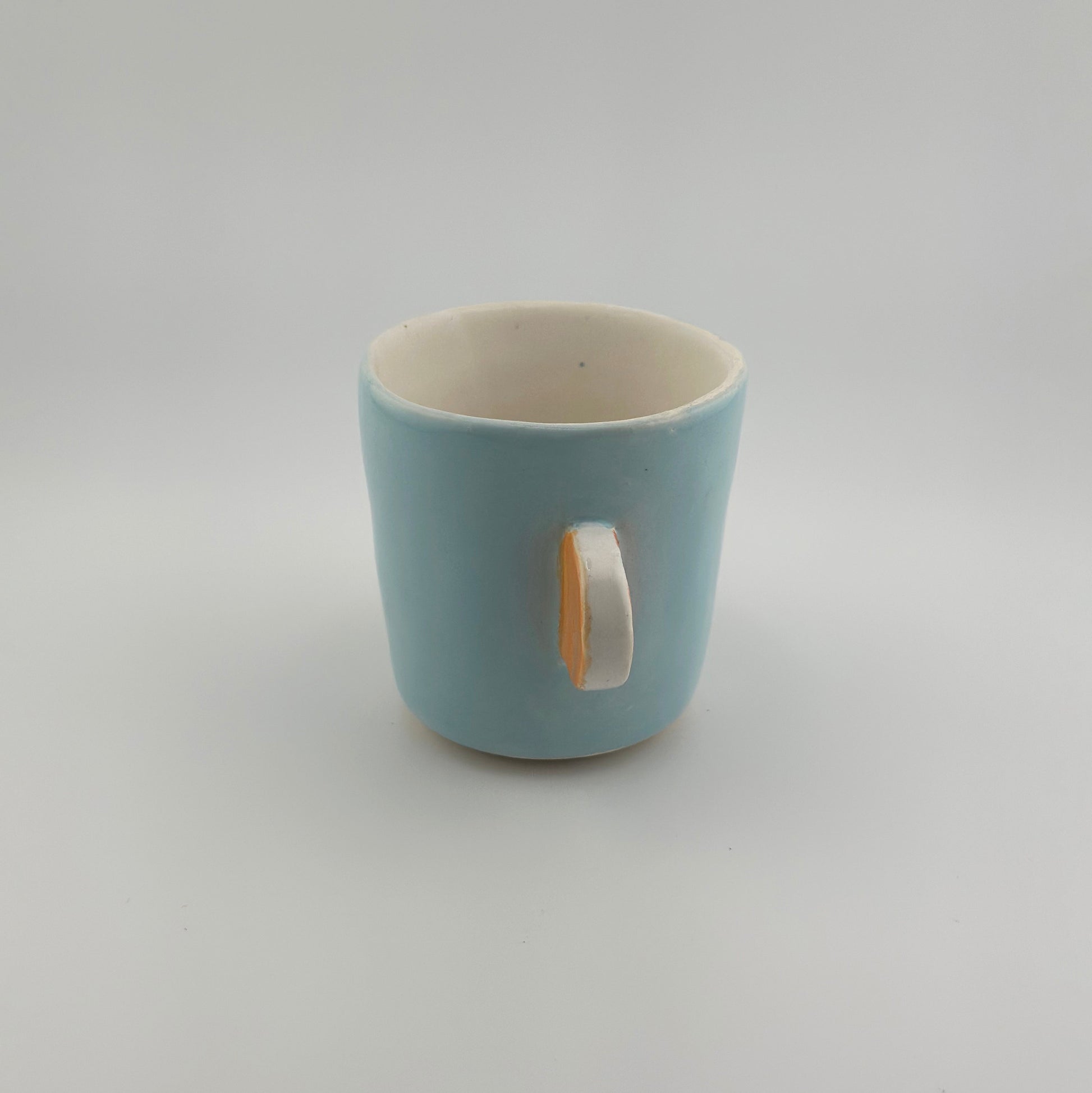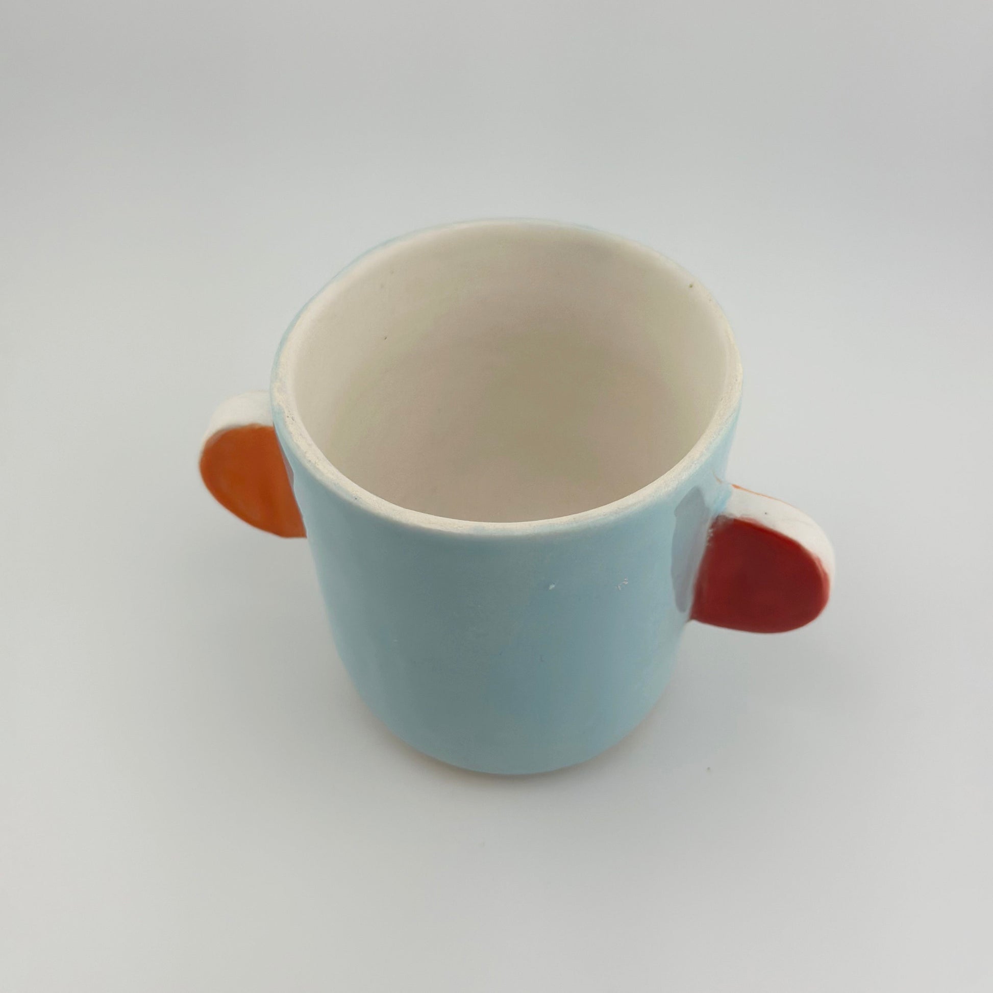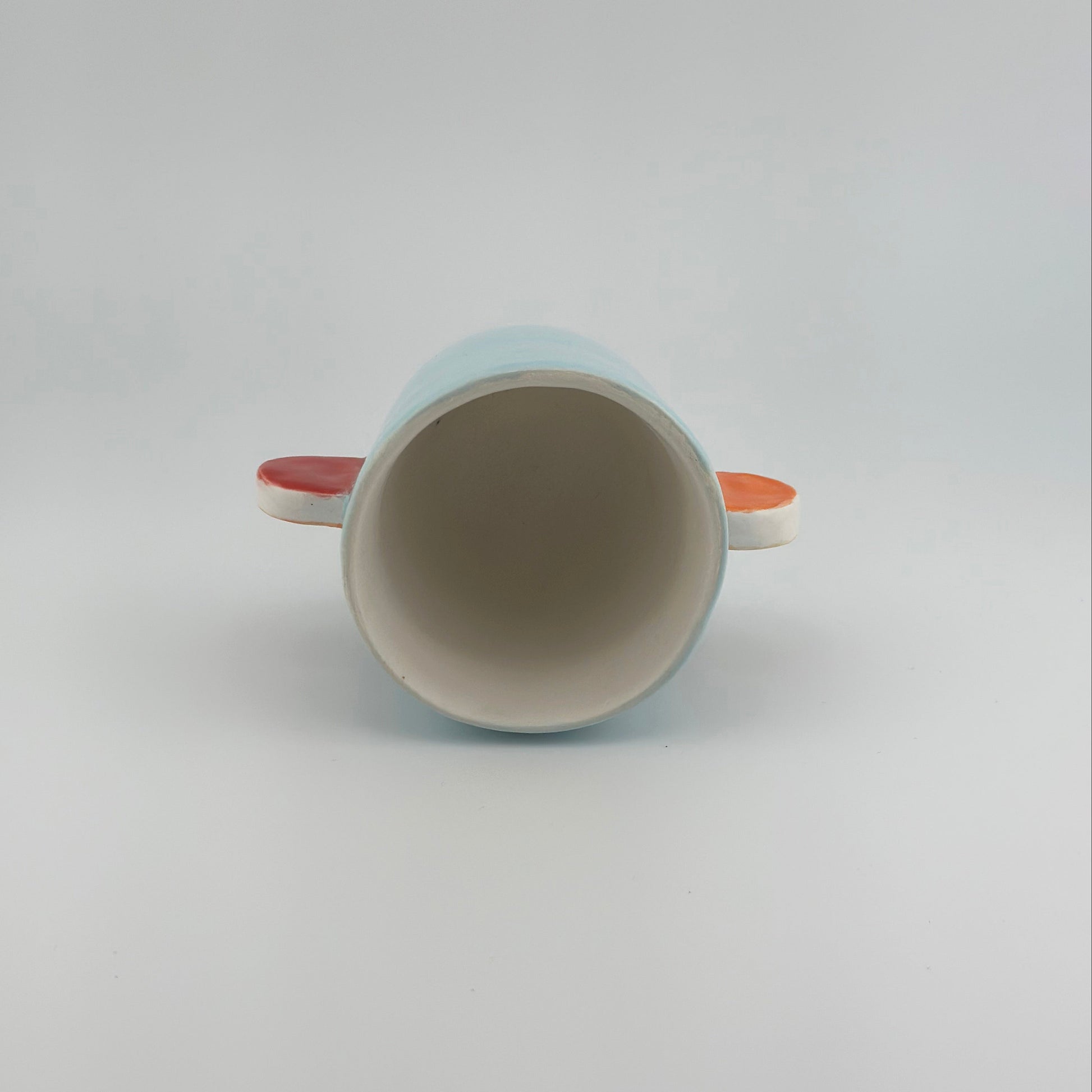 A tiny cup with big personality. The Earwig Espresso Cup is wheel-thrown, finished with two symmetrical ears that feel great to hold. Glazed in sheer blue with contrasting red and orange handles. Its diminutive size makes it perfect for a shot of espresso, a short pour of tea, or a little sip of somethin' special.