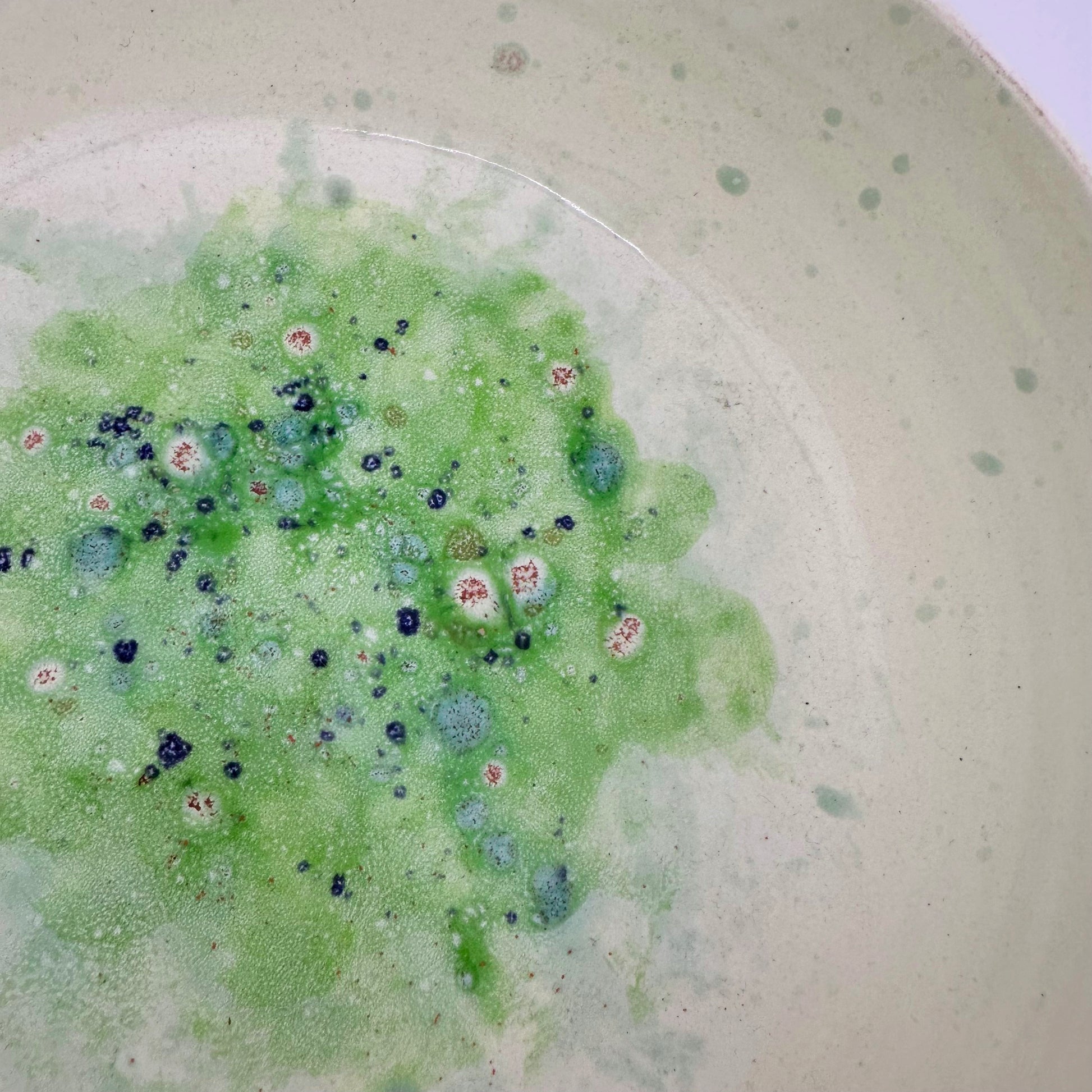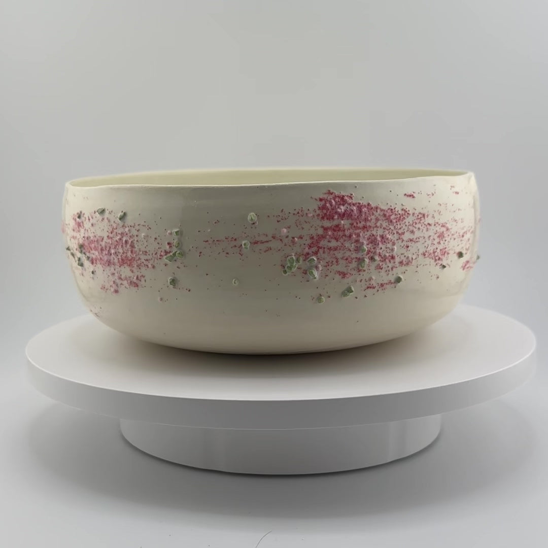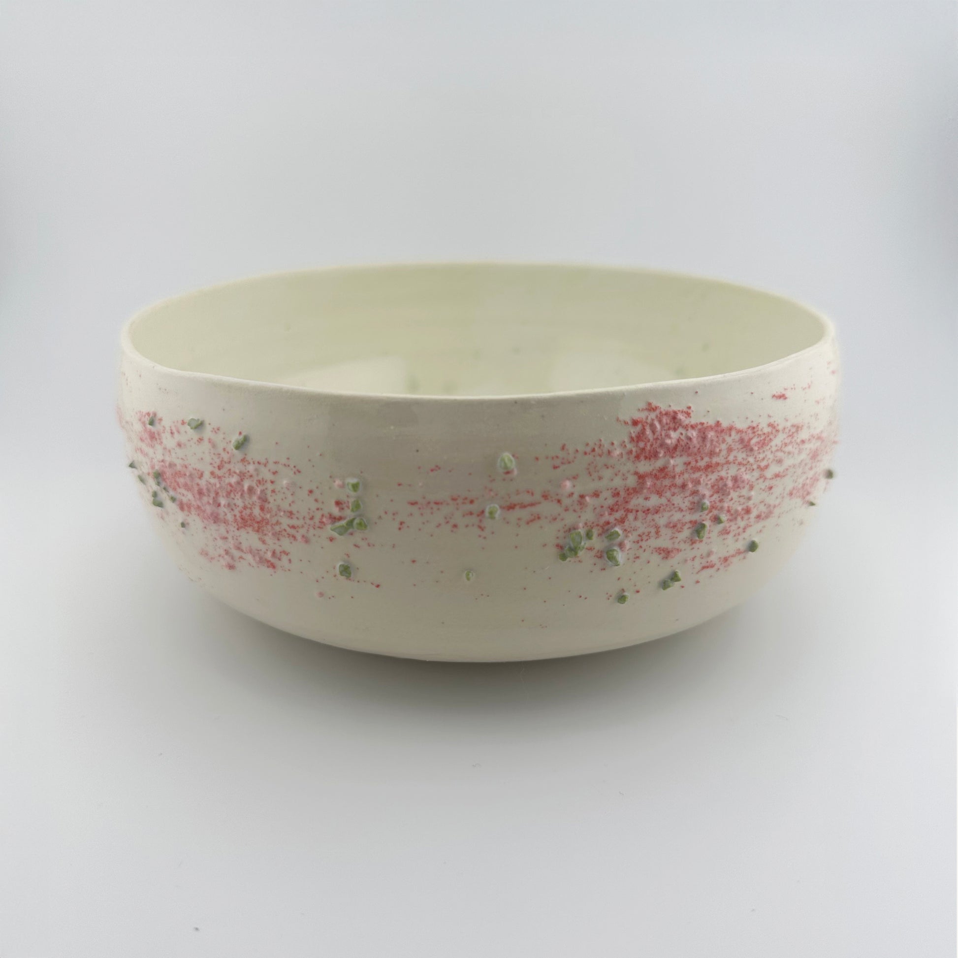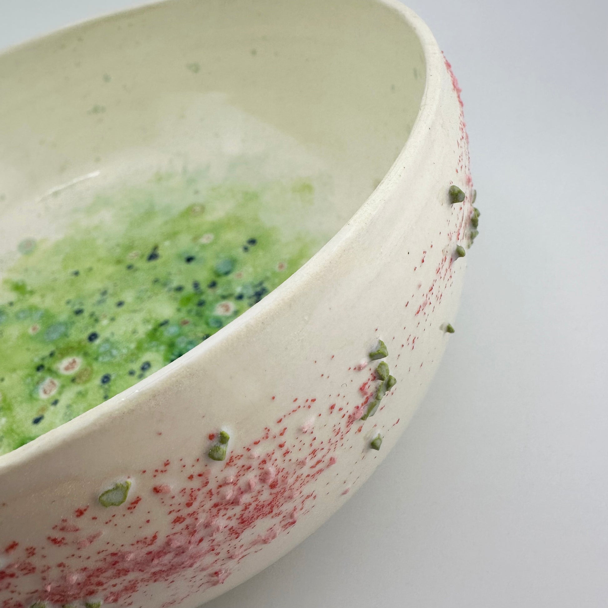 A hand-thrown ceramic bowl with a smooth, lush green interior. The exterior is dusted in a textured, candy pink and soft green crushed clay, set in clear glaze.