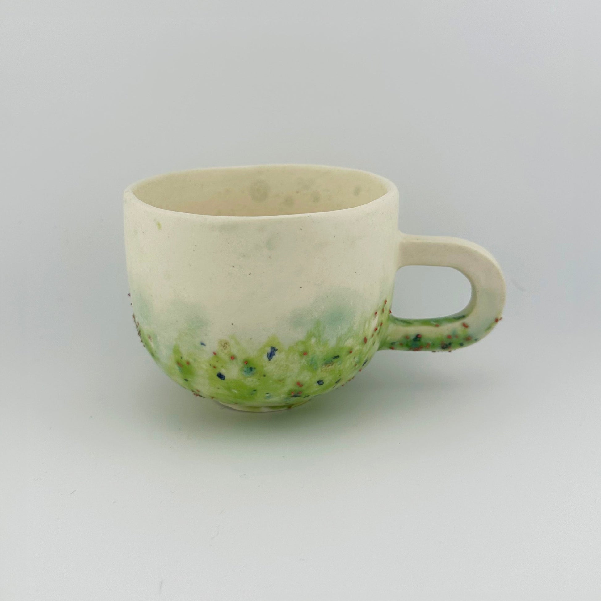 Created exclusively for the TAZO Tea collab, this hand-thrown ceramic teacup is finished in a matte ivory glaze. The outside features a soft dappled green base, flecked with crushed pink clay to evoke wildflowers in fresh grass. The sculptural geometric handle makes it perfect for cradling a hot tea.