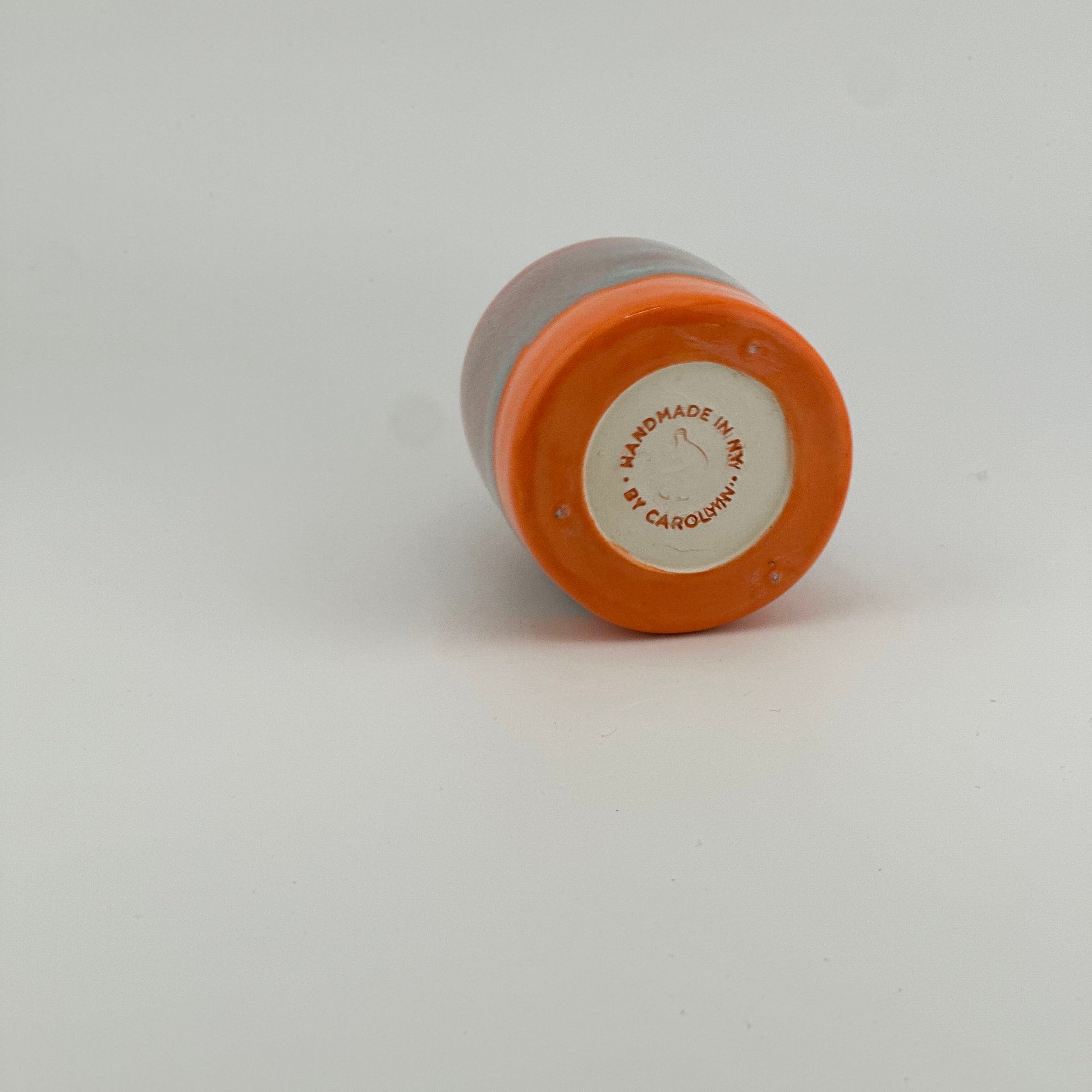 A tiny hand-thrown pot with a soft, sunset-washed surface. A base of tangy orange dipped in blue. Stamped on the base.