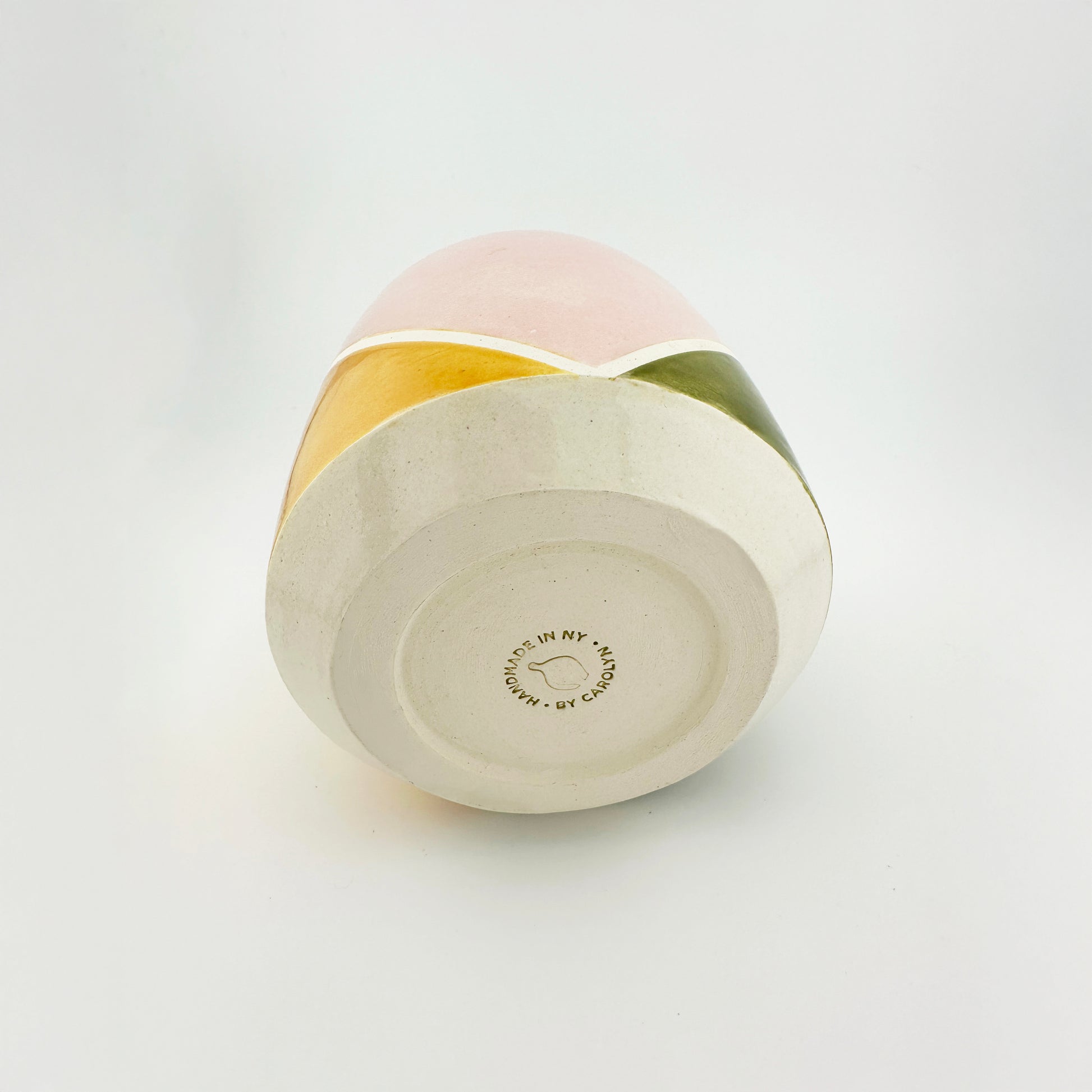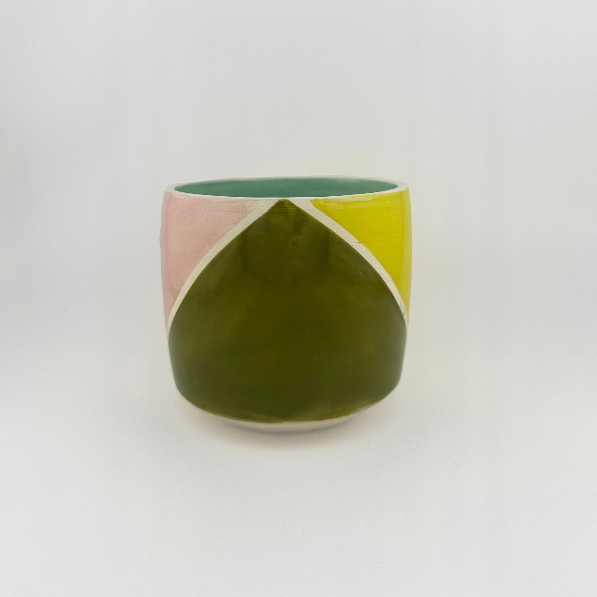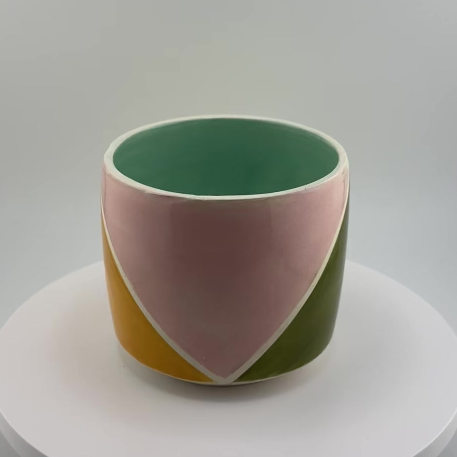 Hand-thrown straight-sided pot, glazed with harmonious color blocks of pink, mustard, green, and chartreuse. This piece will bring a little mid-century modern charm into your space.
