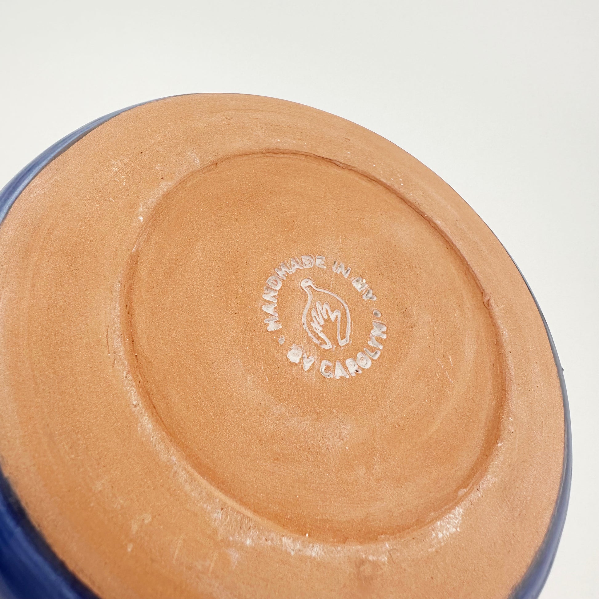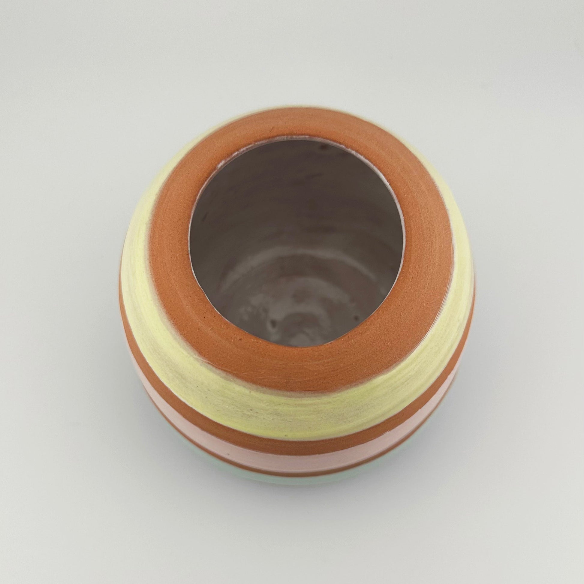 This egg vase is part of the Parade Stripe collection, defined by bands of hand-painted glaze layered over raw terracotta clay. Soft pastels of blush, mint, and butter yellow are anchored by a navy stripe at the base give it a faded, nostalgic feel.