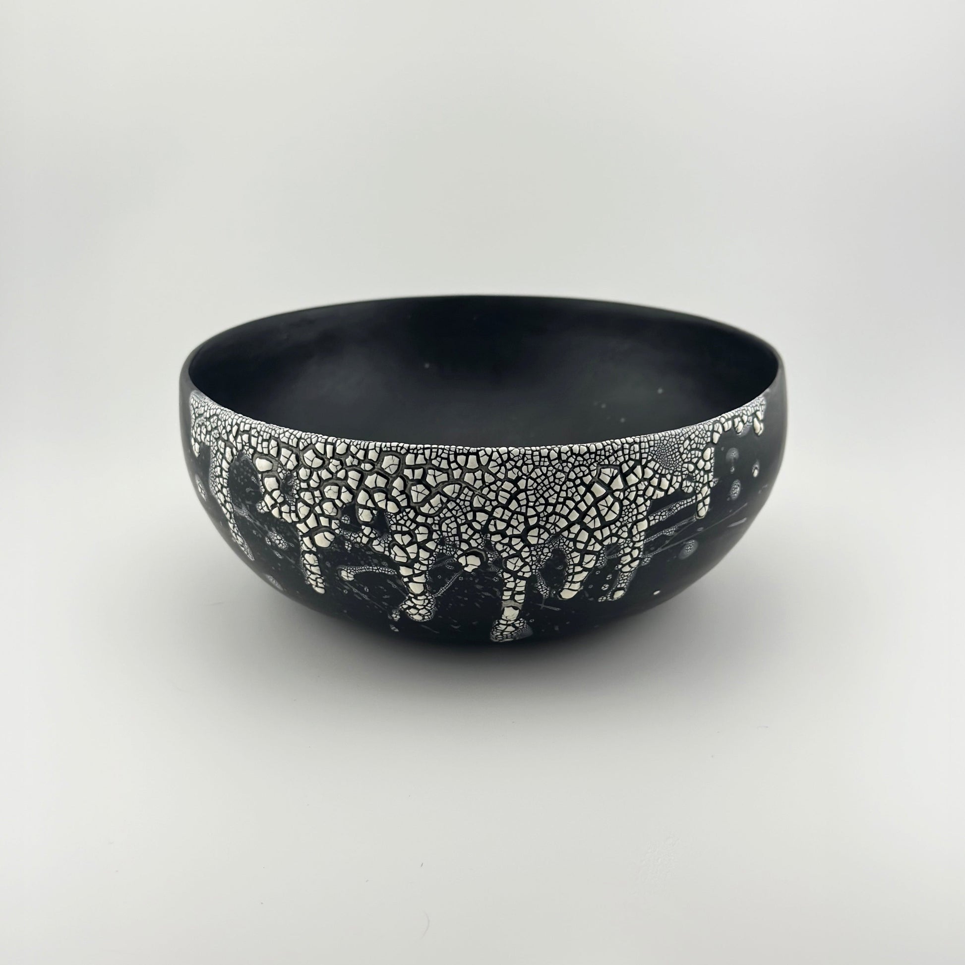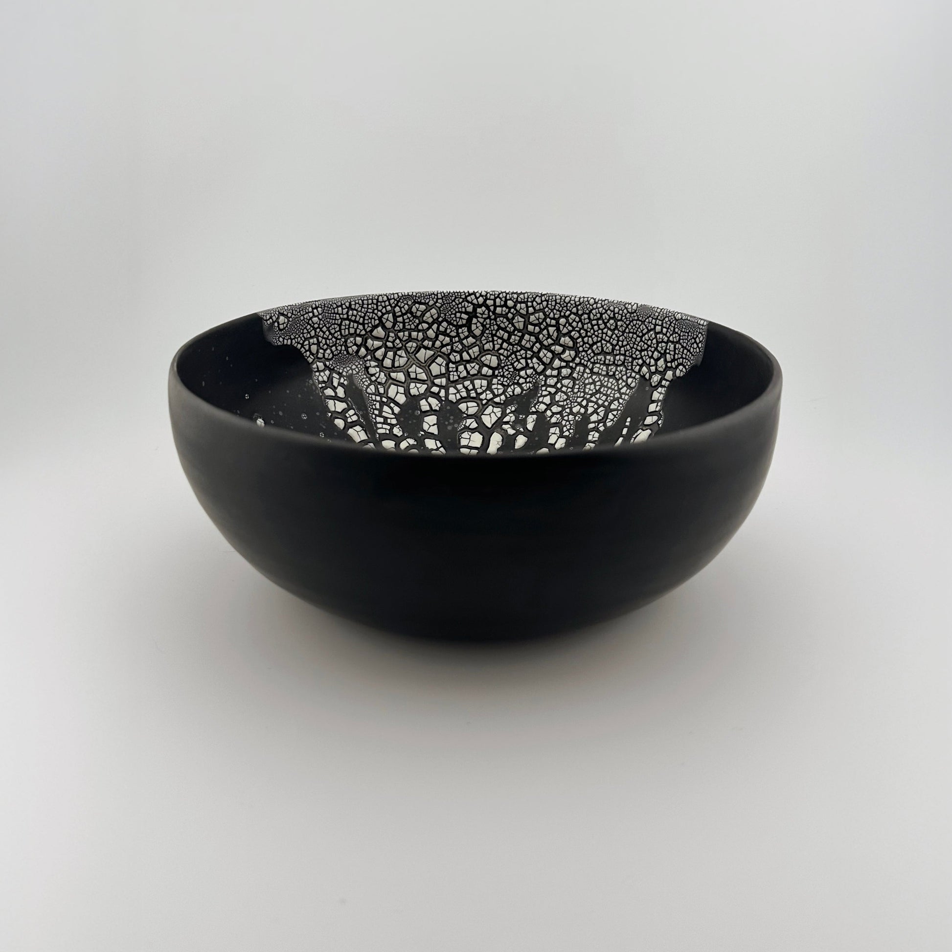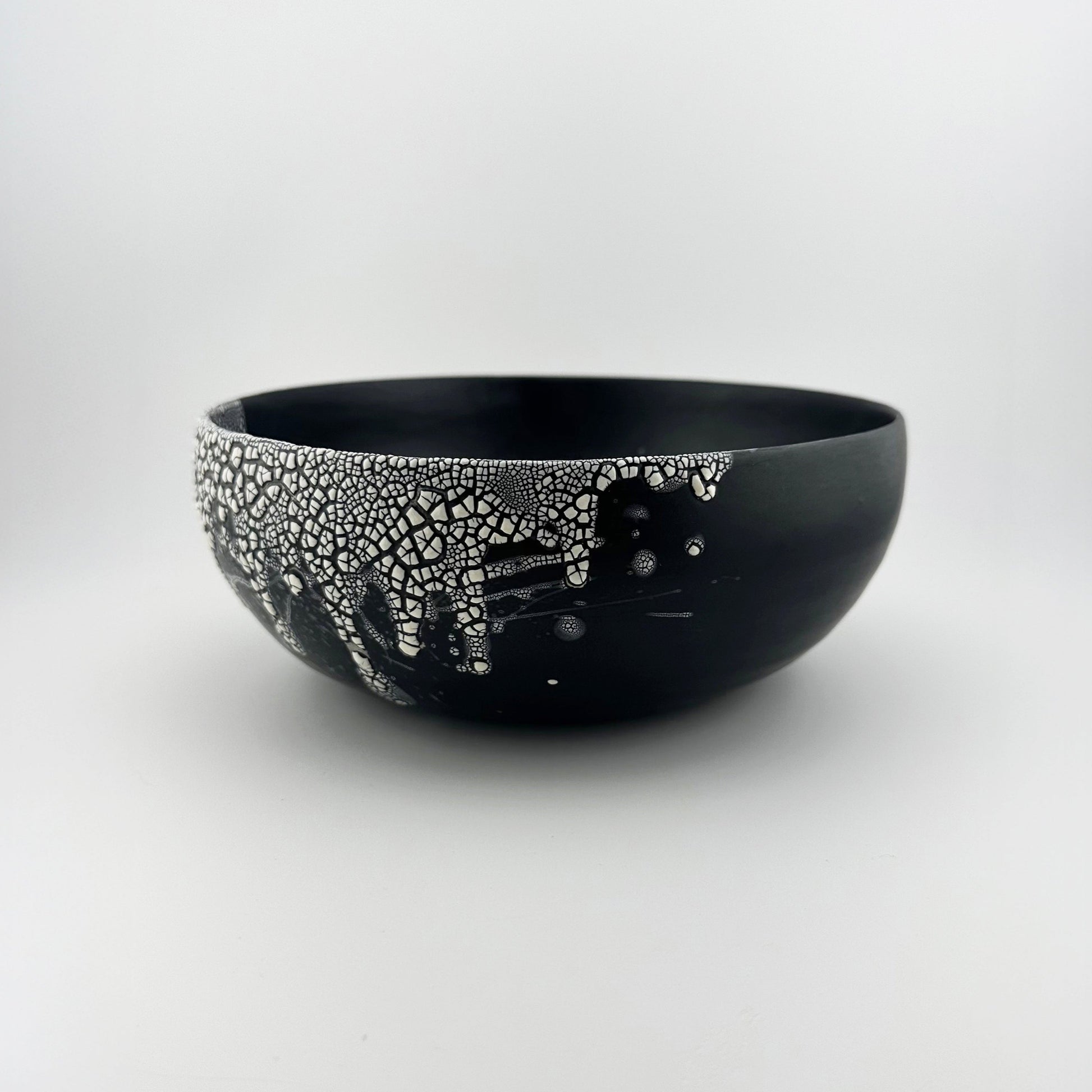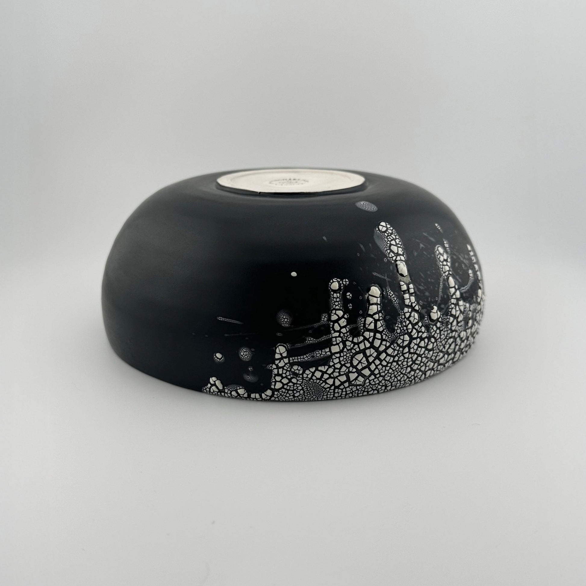 Hand-thrown, shallow ceramic bowl in smooth matte black, finished with a wild splash of white crackle glaze. Like ocean foam or lava caught mid-motion. Both functional and sculptural, this bowl would make a dramatic centerpiece or serving dish.
