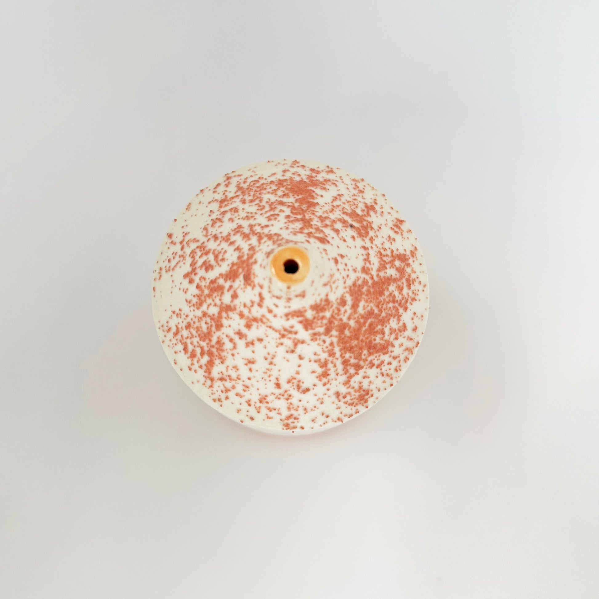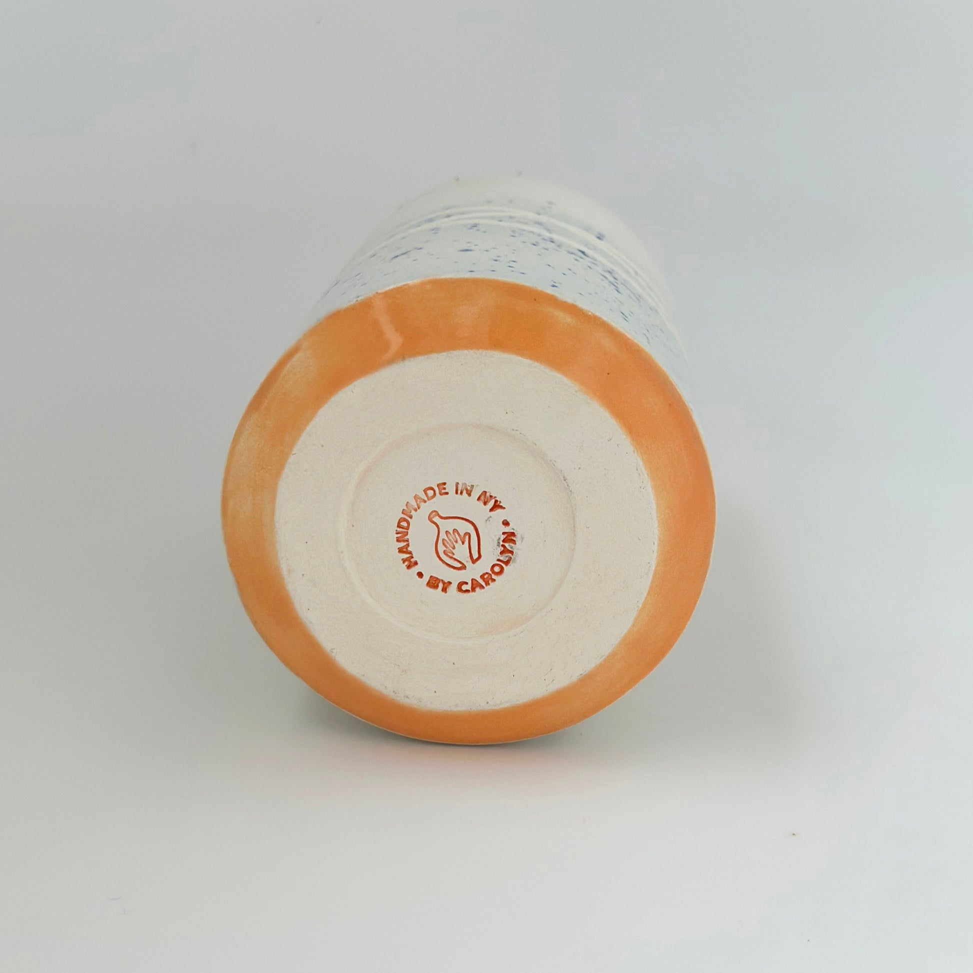 This vase features a conical top, dusted with crushed pink clay, evoking the sweet sugar rim of a cocktail glass. The top has a pinhole opening with a pop of orange. An organic ribbon of raw clay circles the middle, breaking up the sheer blue glaze and scattered blue speckles.