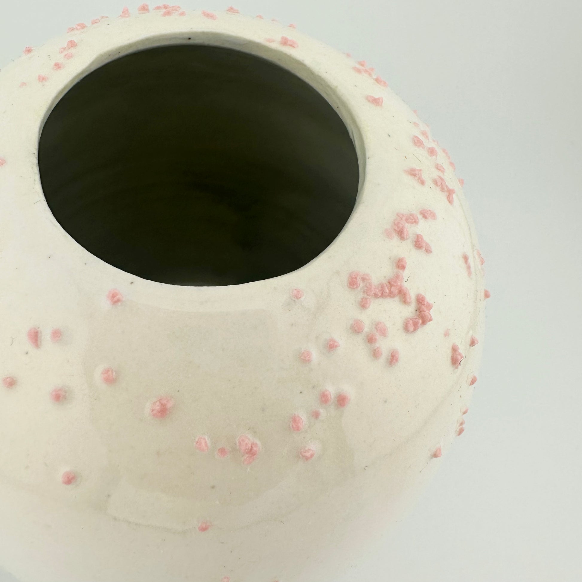 This hand-thrown bud vase features a calming green glaze on the lower half, finished with a blush-pink trim at the base. Features tiny, raised speckles on top like petals floating in the air. Fully watertight, just add your favorite stems.