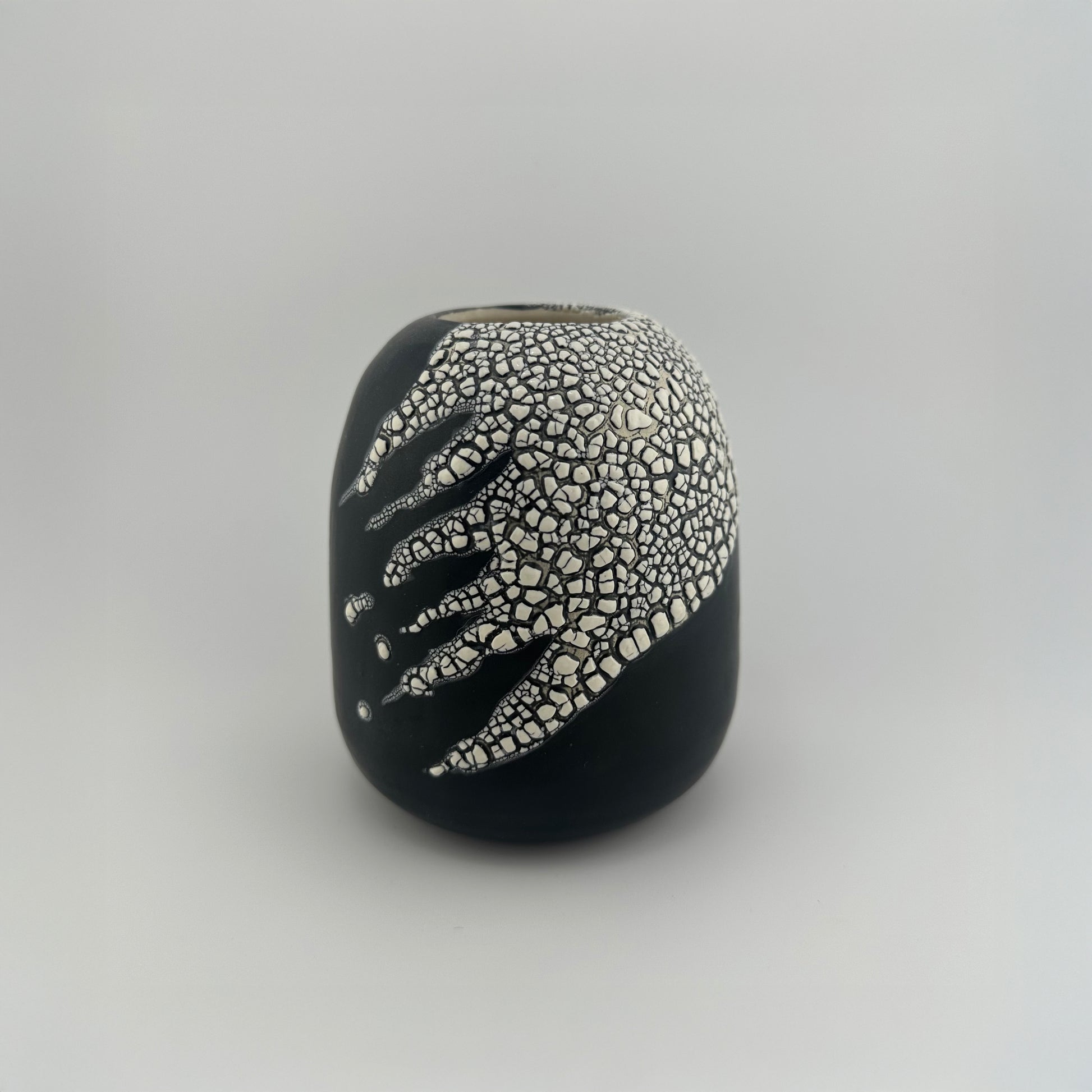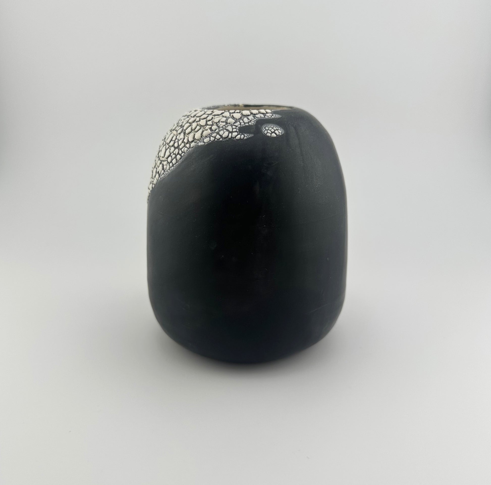 A velvety smooth matte black background is the perfect canvas for this white crackle glaze. This piece is compact yet sculptural, capturing the essence of a wind blast frozen in time. The interior is clear glazed, making it watertight and ready for flowers.